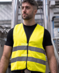 Umsäumt mit schwarzer Polyestereinfassung, Grössenverstellung durch 2 Klettverschlüsse, zertifiziert nach EN ISO 20471, neon pink und neon green EN 17353 Typ AB3 (Tageslicht und Dunkelheit) zertifiziert, zwei 5cm breite Reflexstreifen