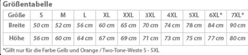 Größen: S – M – L – XL – XXL – 3XL – 4XL – 5XL – 6XL* – 7XL** in ausgewählten Farben erhältlich